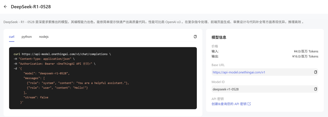 步骤三:给予curl、Python、Node.js三种技术方案,快速接入模型DeepSeek-R1-0528,满足多样化开发场景及开发者使用习惯。