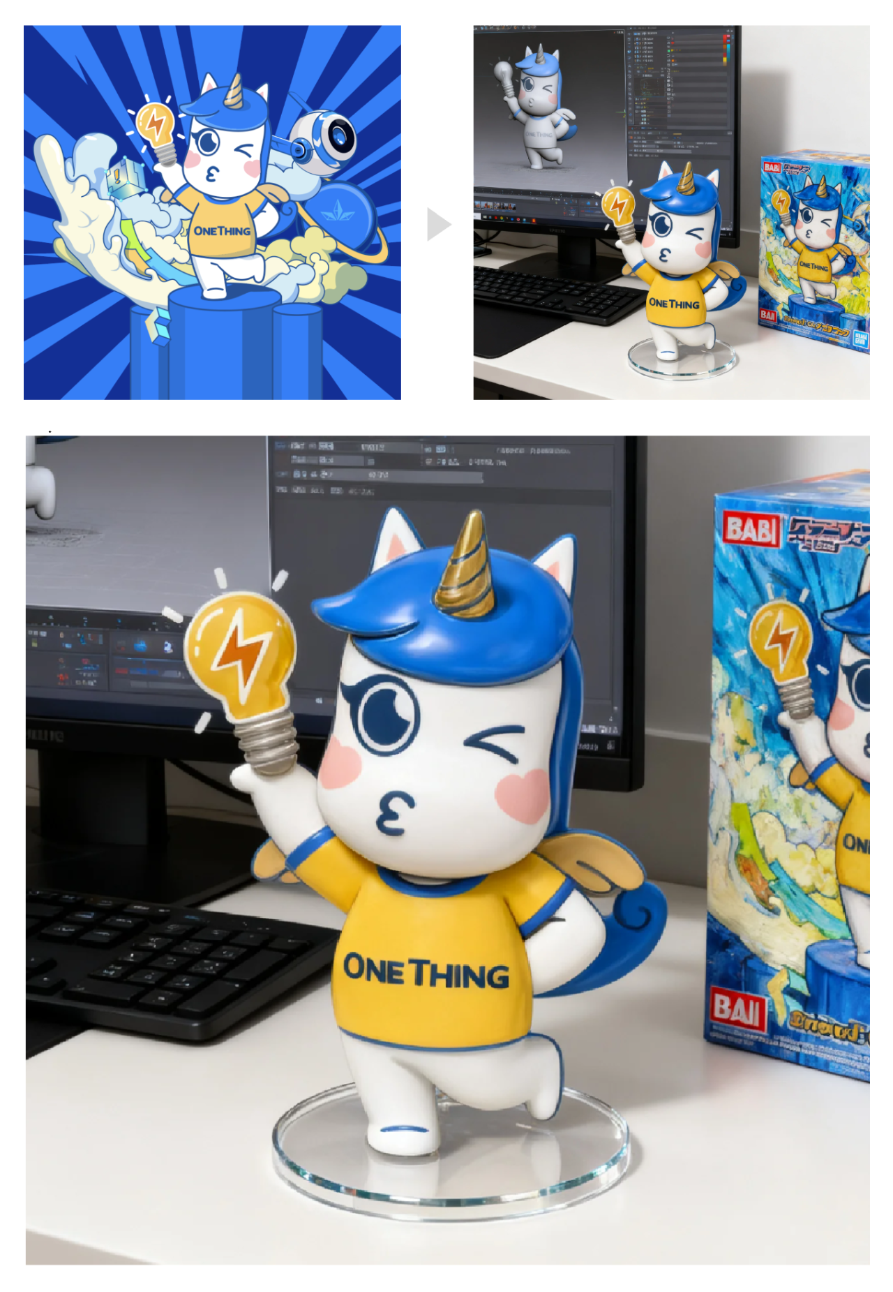 prompt:图中角色的市售手办已推出,为 1/7 比例,写实风格。它被放在电脑桌上,底部是圆形透明亚克力底座。电脑屏幕正展示这款手办的 Zbrush 建模,旁边还有个万代风格玩具盒,盒面印着角色原画。