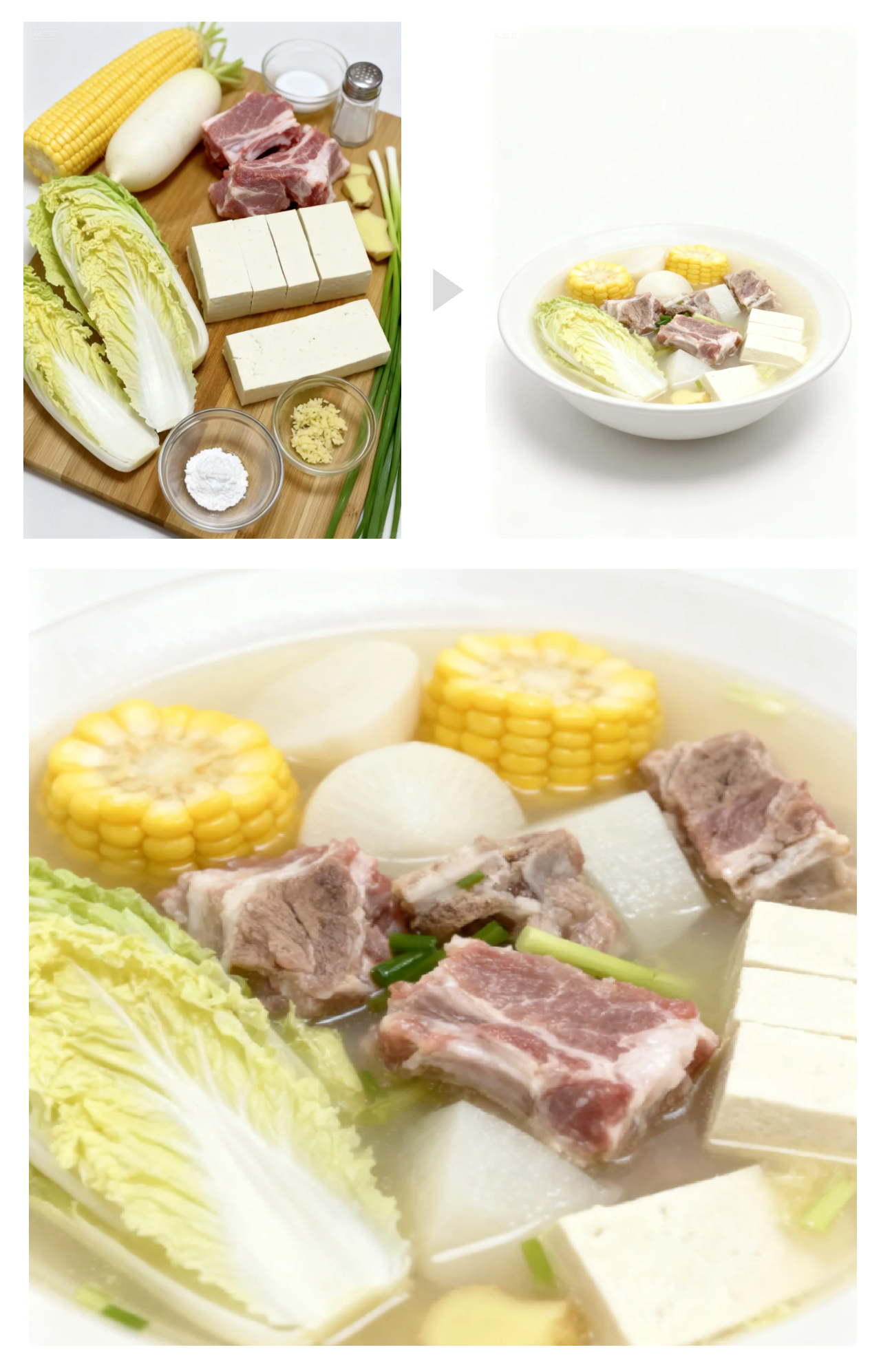 我们提高一下难度,输入一组原材料图(排骨、萝卜、玉米、豆腐等和几种调料),让模型做顿饭,看看它是否偷工减料:
