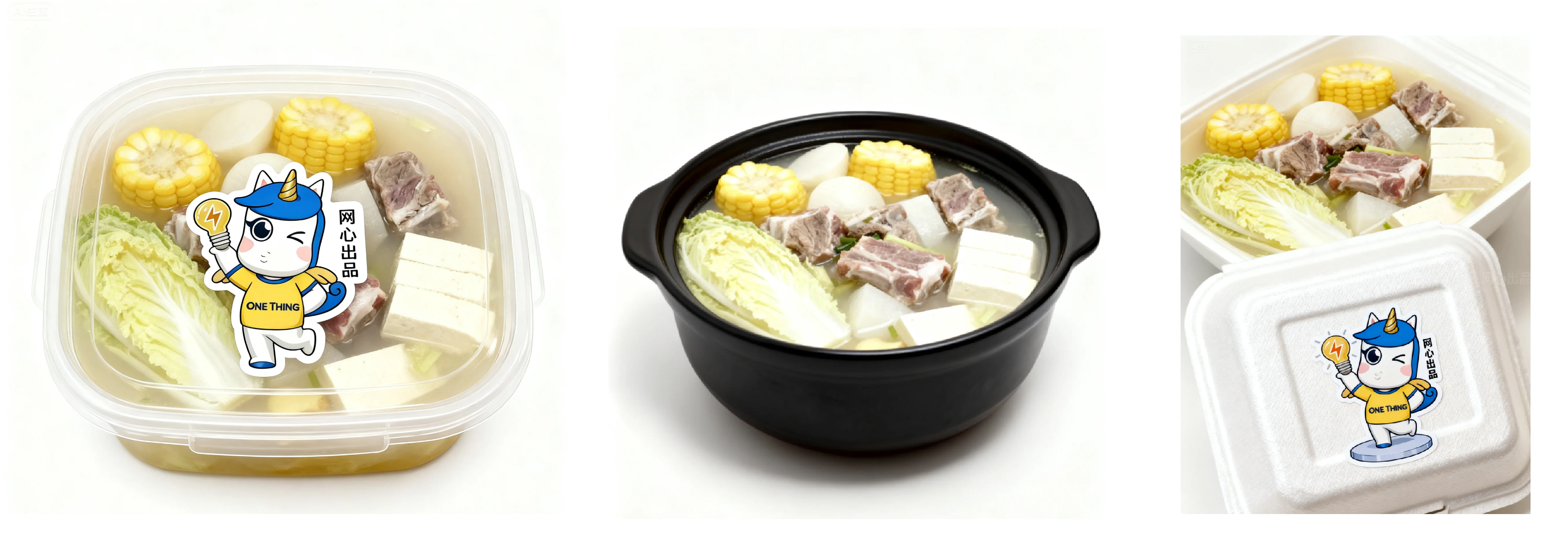 放大来看,几乎所有食材都没有缺席,而且萝卜、玉米还帮我切块了,不得不说这效果与实拍不相上下。我们再微改一下prompt,把它装进不同材质的外卖盒吧: