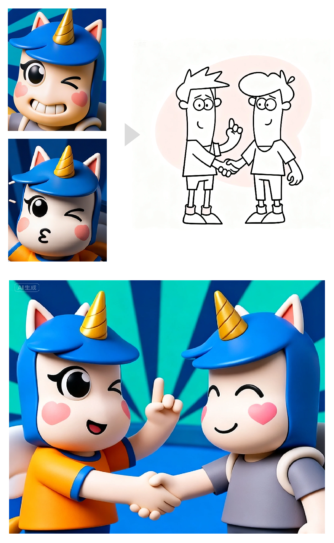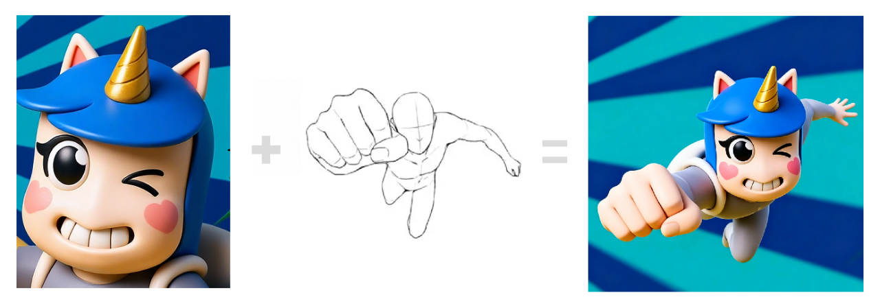 我们上传了一张3D头像,再配一个NPC姿势草图,模型就能自动把草图动作进行一比一还原: