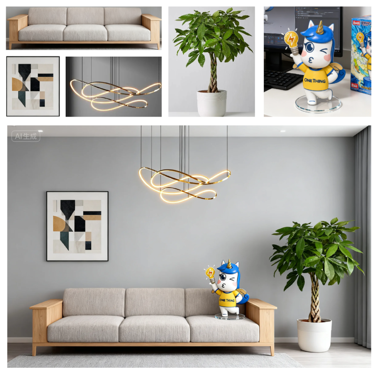 这组测试,我们重新装饰一下办公室:从几张风格不一的家具素材图出发,生成一个统一审美的家居空间效果图: