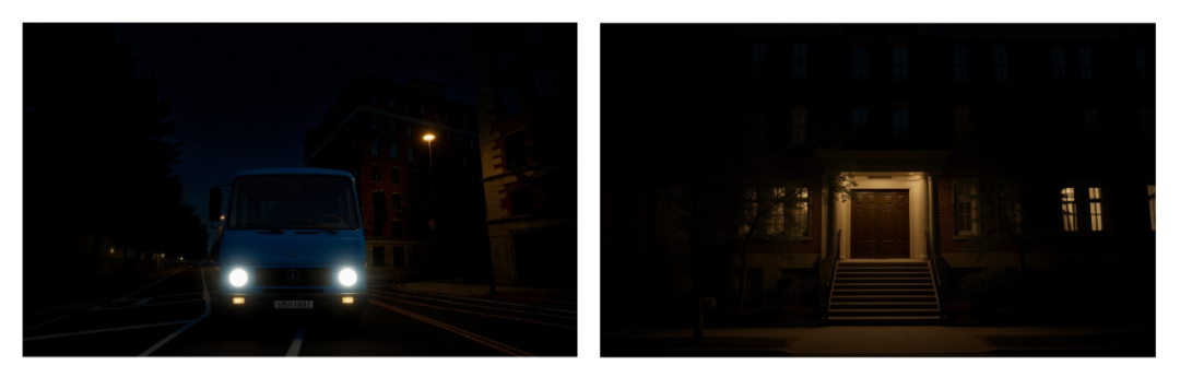 prompt:镜头前驶进来一辆公交车,车灯明亮,最后在主角的豪宅面前停了下来。