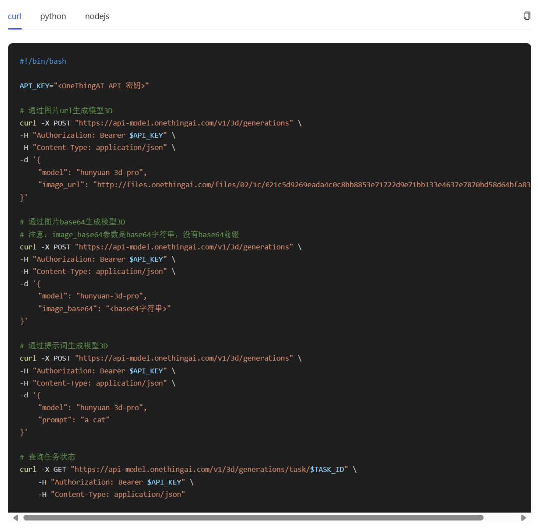 步骤三:OneThingAI平台给予curl、Python、Node.js三种技术方案,以便快速接入混元3D,满足多样化开发场景及开发者使用习惯。