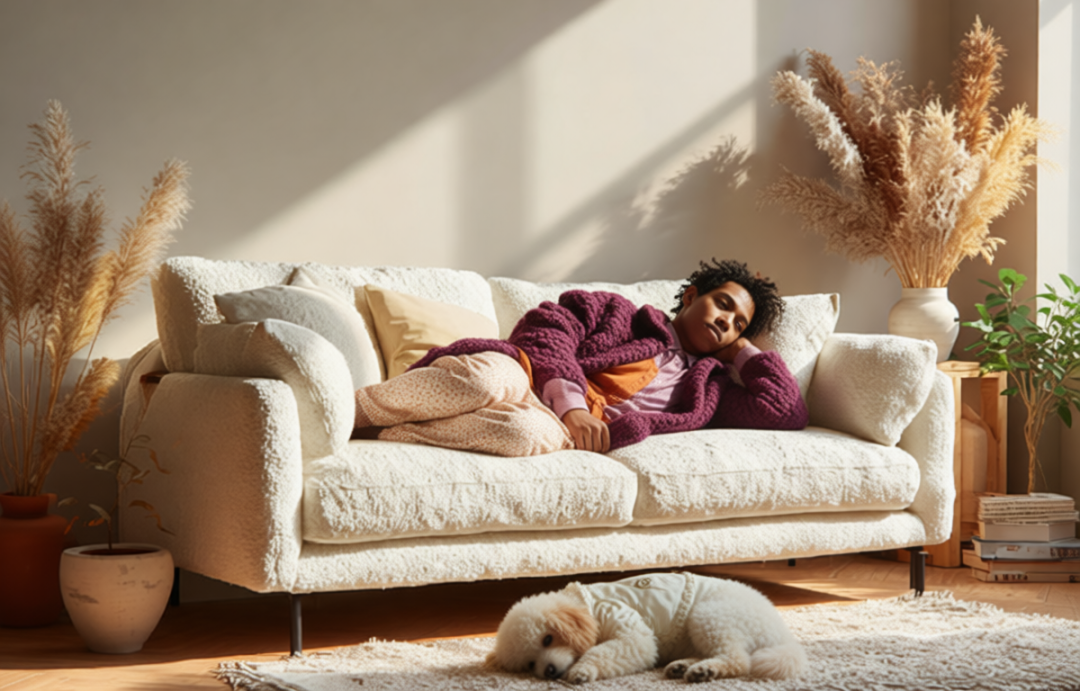 提示词:让图1中的男子躺在图3的沙发上,再让图2中的小狗躺在图3的地板上睡觉。
