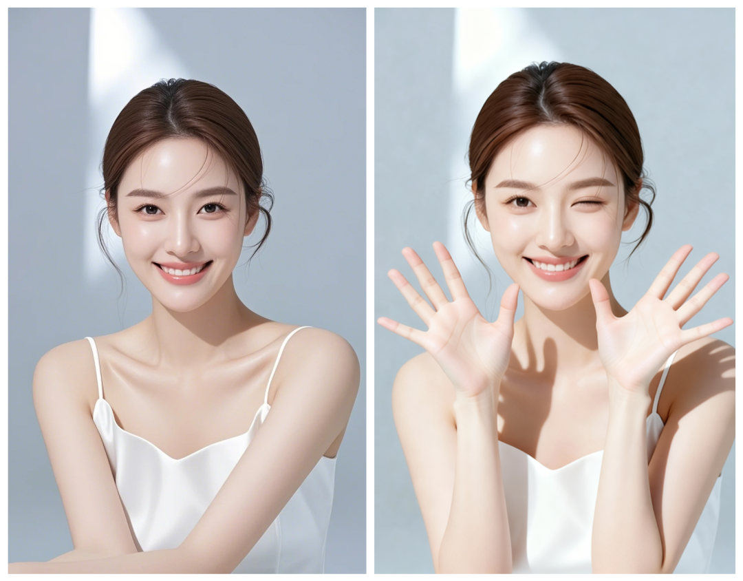 提示词:让图1中的人物双手举起,手掌朝向镜头,手指张开,眯左眼,做出一个俏皮的姿势