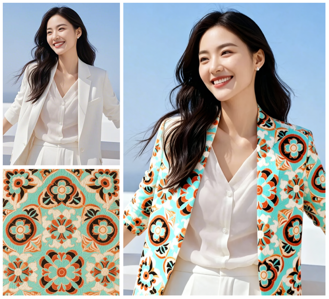 提示词:把图片1的印花印刷到图片2人物的外套上