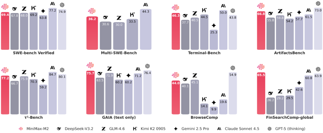 MiniMax M2 在几乎所有基准测试中均进入前三,尤其在SWE-bench Verified(69.4 分)和FinSearchComp-global(65.5 分)中表现亮眼,展现出强大的多场景适配性与性能均衡性。