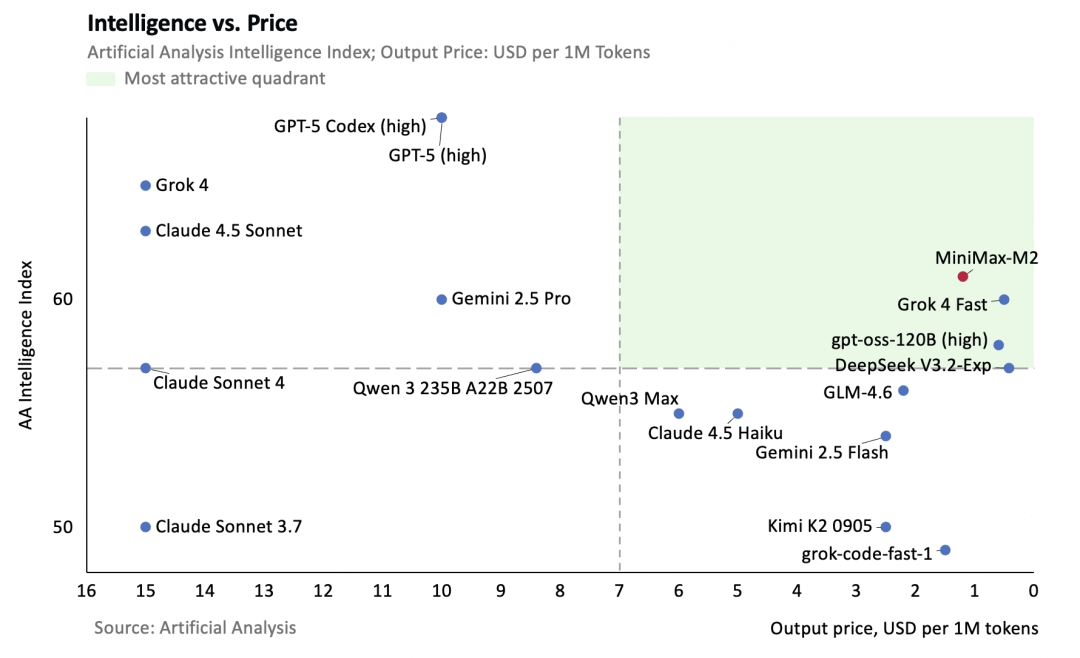 在 Artificial Analysis 关于“智能 VS 价格”与“输出速度 VS 价格”的测评中,MiniMax M2 均落入 Most attractive quadrant(最具吸引力象限),实现了智能、速度与成本的最佳平衡。