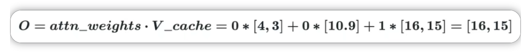 Softmax 权重的计算过程简化处理,因为最后一个分数 276.52 远大于前两个。经过 Softmax 后,几乎所有的权重都集中在了第三个分量上。为简化说明:attn_weights≈[0,0,1](仅为演示)。